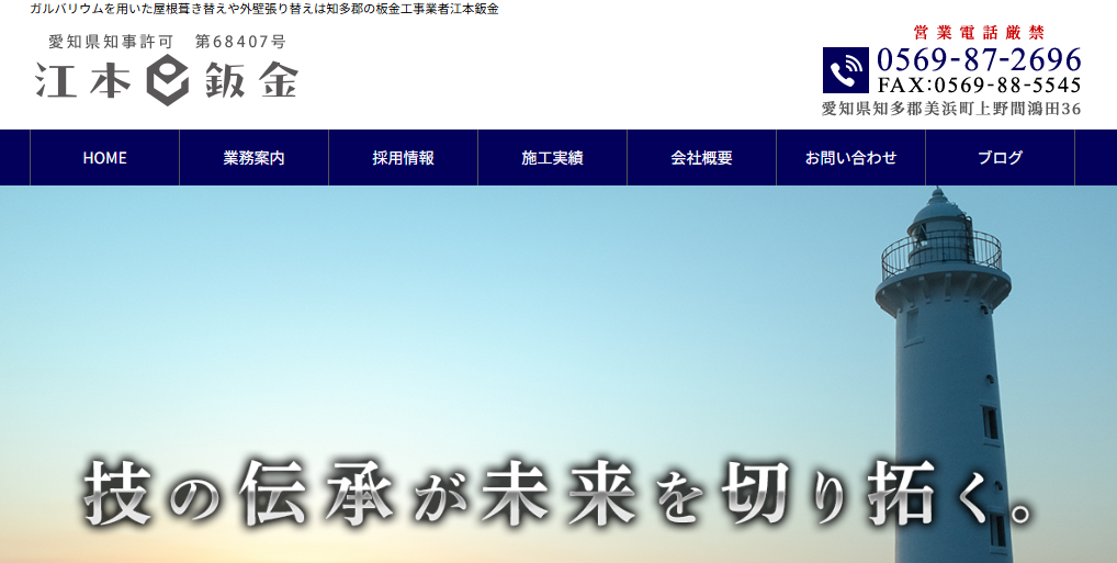 株式会社江本鈑金は、愛知県知多郡美浜町に拠点を置く建築板金工事の専門業者です。平成11年3月1日に創業し、平成27年8月3日に法人化されました。代表取締役の江本利光氏のもと、7名のスタッフが在籍しています。同社は、ガルバリウム鋼板を用いた屋根の葺き替えや外壁の張り替えなど、建築板金工事全般を手掛けて