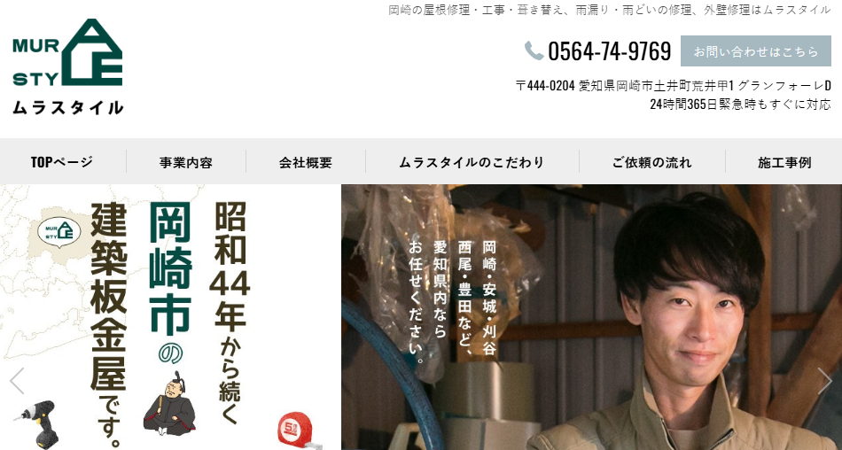 ムラスタイル株式会社は、昭和44年創業の岡崎市に拠点を置く建築板金の専門業者です。屋根や外壁、雨どいの修理・塗装を中心に、外観の美しさだけでなく、腐食やヒビなどの劣化や損傷の修繕を行っています。年月とともに劣化する建物を守るため、定期的なメンテナンスを推奨しており、無料見積もりや24時間365日の緊