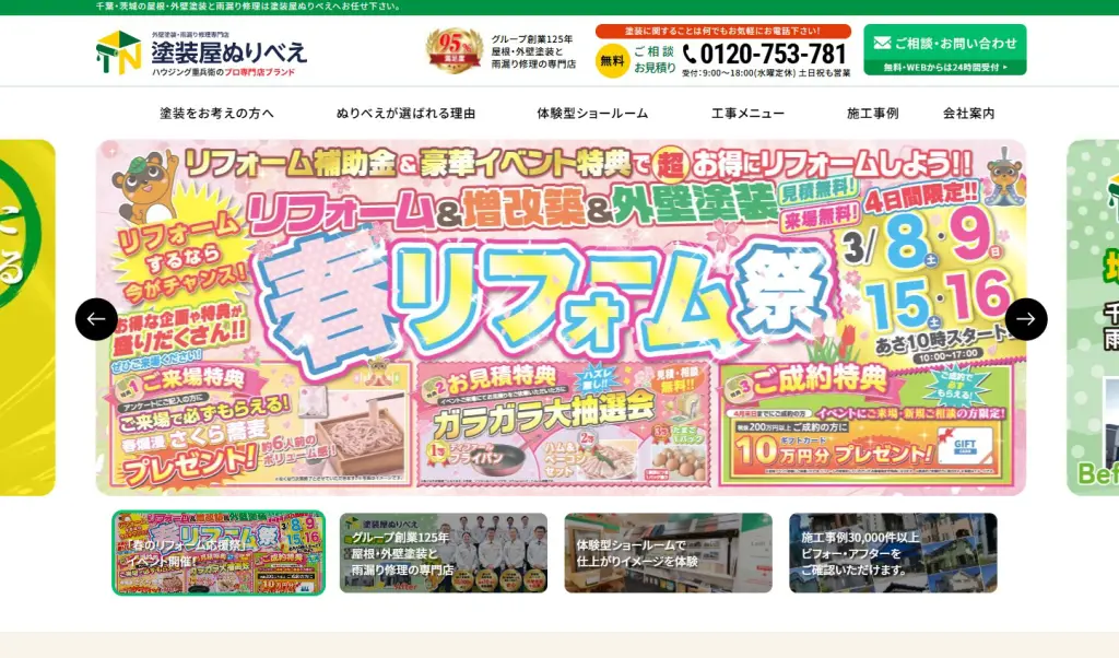 塗装屋ぬりべえは、グループ創業125年の歴史を持つ、千葉・茨城エリアに密着した屋根・外壁塗装と雨漏り修理の専門店です。体験型ショールームを備え、仕上がりのイメージを事前に確認できる点が特徴です。施工実績は30000件以上に上り、豊富な経験と知識を活かした高品質な施工を提供しています。自社施工と大量仕