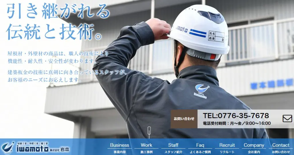 株式会社岩本は2017年4月に法人化した福井県の板金工事専門業者で、代表取締役の岩本成人氏が2001年10月に個人事業として創業しました。金属屋根(ガルバリウム鋼板屋根)などの屋根リフォーム・屋根修理を含む外装リフォーム全般を手掛けており、福井県の板金技能選手権で入賞するほどの実力を持つ職人が在籍し