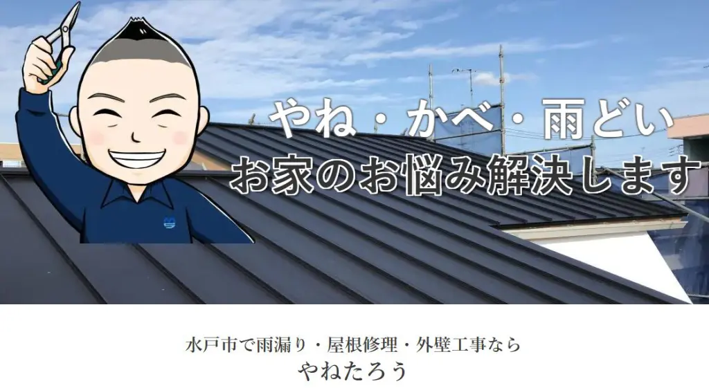 やねたろう(有限会社エムエス工業)は水戸市を拠点に、茨城町を含む県内全域で金属屋根(ガルバリウム鋼板等)の葺き替え、板金工事、雨樋修理、外壁張替えなどを専門とする地域密着型職人直営店です。創業から20年以上、1級板金技能士など資格を有する職人が施工を担当。施工事例や工業会での受賞歴があり、ドローン点
