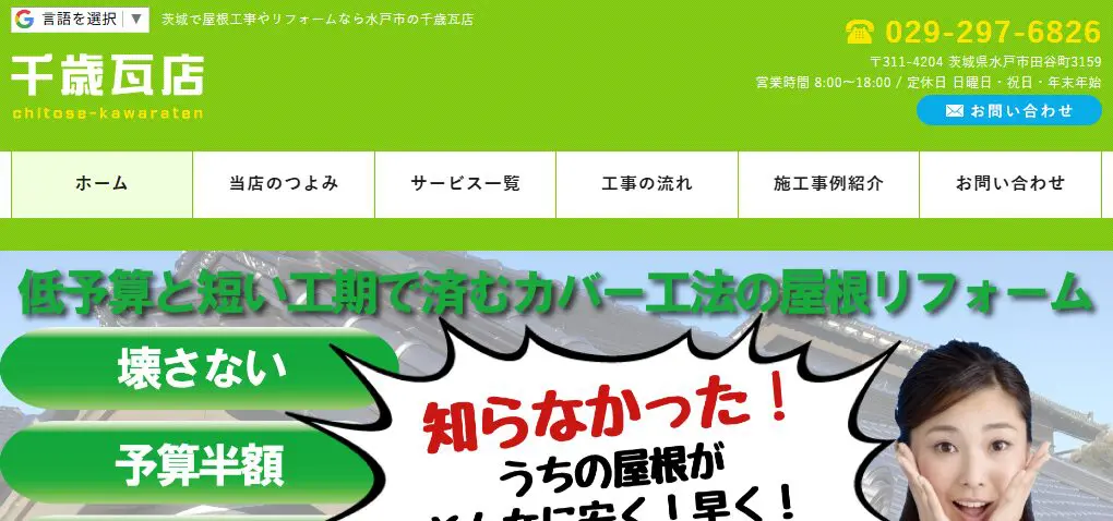 千歳瓦店は創業100年以上の歴史を持つ、水戸市田谷町に拠点のある屋根専門の地域密着工事店。瓦工事、葺き替え、雨漏り修理、ガルバリウム鋼板カバー工法などを完全自社施工で提供し、中間マージンなしのリーズナブルな価格設定が強みです。ドローンを使った無料点検にも対応。保証体制も整え、「地域社会に貢献し高品質