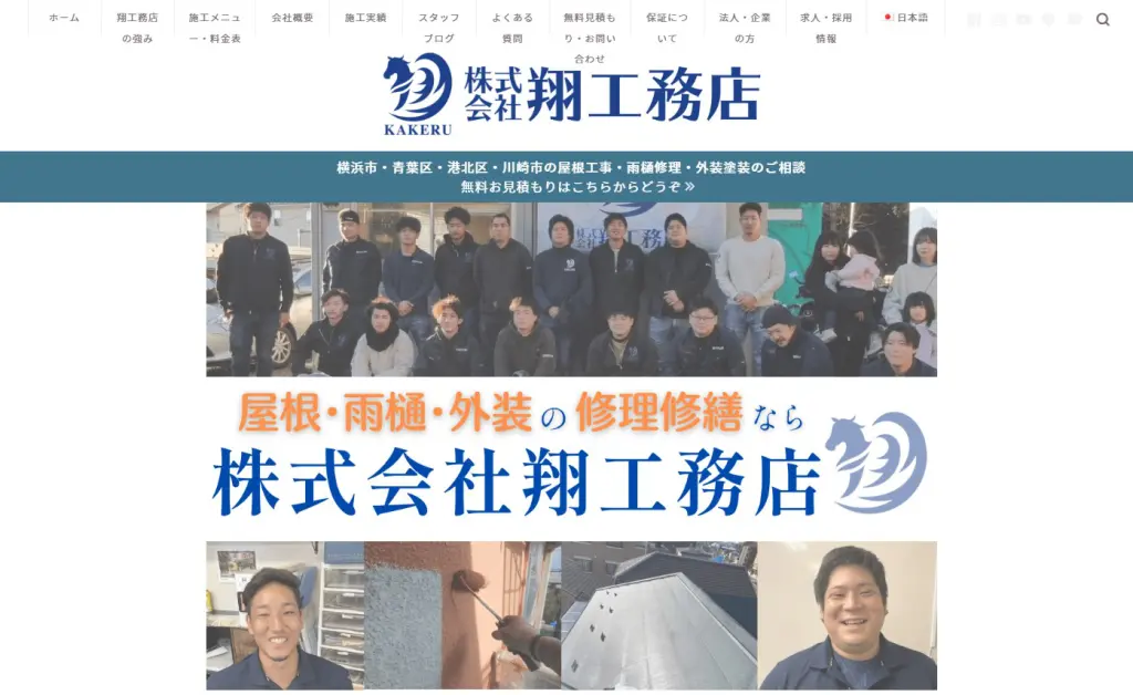 株式会社翔工務店は、神奈川県横浜市青葉区に拠点を置く外装リフォーム専門会社です。主な事業内容として、屋根工事、雨樋工事、塗装工事、仮設足場工事、外構工事、防水工事などを手掛けており、これらの工程を完全自社施工で行うことで、コスト削減と高品質な施工を実現しています。特に、屋根修理や雨漏り修理においては