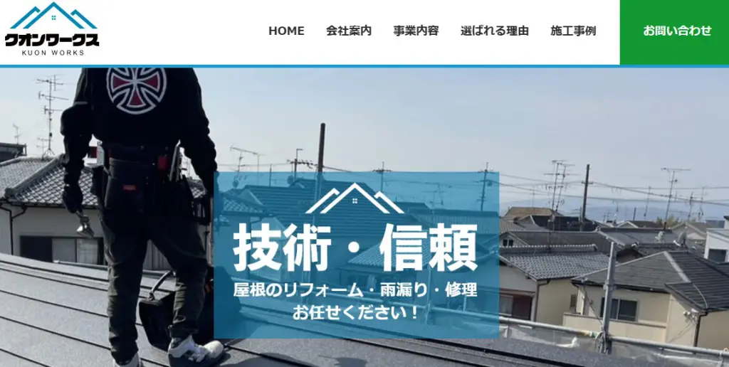 クオンワークスは、京都府京田辺市に拠点を置く、屋根修理・リフォーム専門の地域密着型企業です。自社施工により中間マージンを排除し、高品質な施工を適正価格で提供しています。代表自らが見積もりから施工まで担当し、明瞭な見積もりと丁寧な説明を心掛けています。京都府全域、大阪府、奈良県に対応し、迅速な対応が可