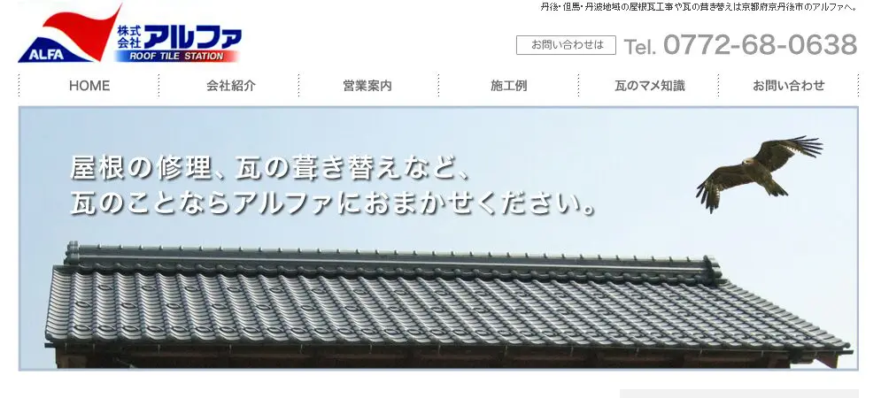 株式会社アルファは、京都府京丹後市に拠点を構える屋根瓦工事専門業者です。瓦の葺き替えや雨漏り修理など、瓦に関する多くのサービスを提供しています。石州瓦、三州瓦、各種陶器瓦など、多種多様な瓦を取り扱っており、用途や外観に合わせて選ぶことができます。また、屋根工事に必要な資材や機械工具も販売しているため