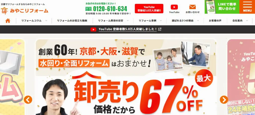 みやこリフォームは、京都市下京区に本社を構えるリフォーム会社で、昭和28年に創業し、60年以上の歴史を持ちます。母体が住宅設備の卸売業であるため、ユニットバスやシステムキッチンなどを最大70%オフで提供できるのが特徴です。屋根修理や外壁塗装、雨漏り補修などの外装リフォームにも対応しており、現地調査や