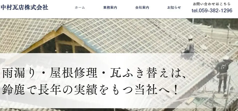 中村瓦店株式会社は、創業94年の歴史を誇る屋根工事の専門店で、鈴鹿市を拠点に地域密着の施工を行っています。雨漏り修理、瓦葺き替え、屋根補修、外壁塗装、解体など幅広い工事を自社施工で対応。現地調査・診断・見積を無料で実施し、お客様の要望を丁寧に汲み取って最適プランを提案。施工後もアフターサービス体制が