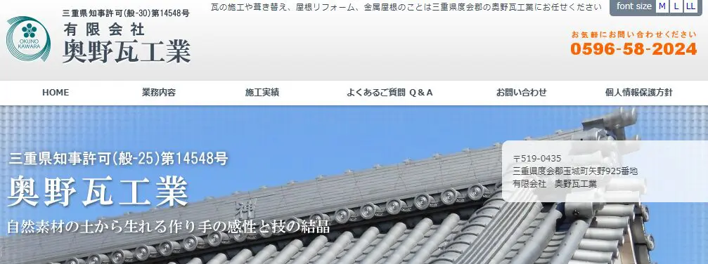 奥野瓦工業は、度会郡玉城町に本拠を置く、古くからの瓦製造・工事を手がける専門店です。現在は伝統的な瓦屋根から金属屋根、太陽光設置対応の屋根リフォームまで幅広く対応。創業は100年以上前の窯元起源で、瓦素材の深い知見を持ち、職人が現地調査・施工までを一貫して手がけます。塗り替えや葺き替え、雨漏り補修、