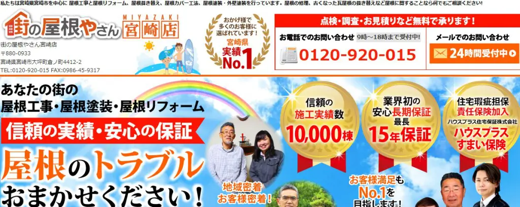 街の屋根やさん宮崎店は、宮崎市を拠点に県内各地で屋根修理・葺き替え・雨漏り対応などを手がける専門店です。15000件を超える施工実績と、750件以上の口コミ評価を有しており、経験豊富な職人による自社施工が特長です。中間マージンを排除した適正価格での工事や、現地調査・見積の無料対応、最長10年保証、火