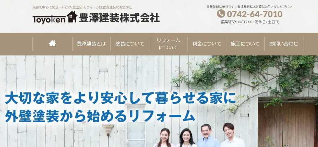 豊澤建装株式会社は、奈良県奈良市に本社を構える外装リフォーム専門業者です。屋根修理、外壁塗装、防水工事、雨漏り修理など、住宅の外装に関する幅広いサービスを提供しています。自社職人による直接施工を行っており、中間業者を介さないため、コストを抑えた適正価格でのサービス提供が可能です。また、詳細な点検と丁