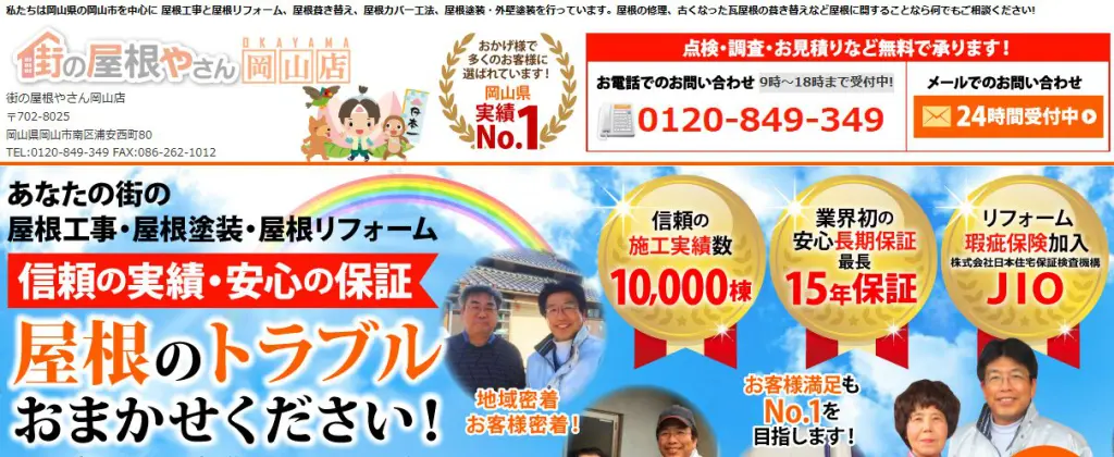 街の屋根やさん岡山倉敷店は、屋根葺き替え・カバー工法・屋根塗装・雨漏り修理などを専門とする地域密着型の屋根修理業者です。累計10000棟以上の施工実績があり、ドローン調査や詳細な写真報告を用いた丁寧診断で安心感が強み。価格・工期・品質・保証を明示した対応を行い、JIO瑕疵保険・10年保証制度も完備。