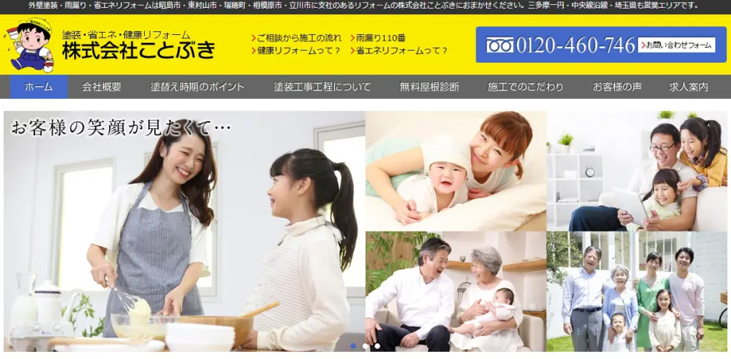 株式会社ことぶきは、平成7年の創業以来、「信頼ある工事で応える」をモットーに、三多摩地域や中央線沿線、埼玉県、相模原市を中心に、外壁塗装や屋根工事、防水工事、省エネリフォームなど、幅広いリフォームサービスを提供しています。社員の約7割が有資格者であり、豊富な経験と確かな技術力を持つ専門スタッフが在籍