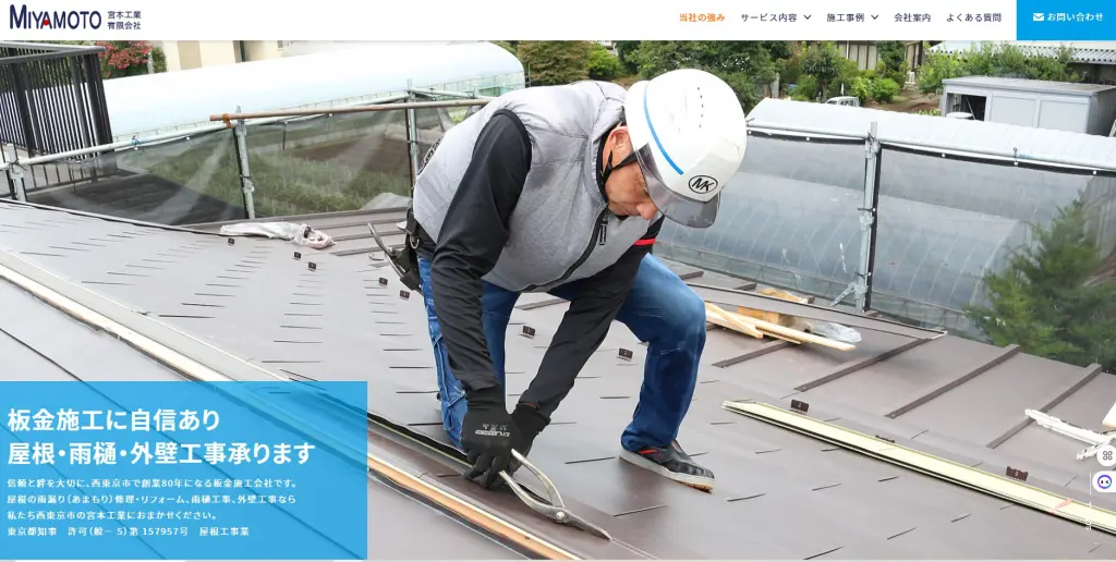 宮本工業有限会社は、東京都西東京市に拠点を置く、創業80年の板金施工業者です。主に戸建て住宅を対象に、屋根の雨漏り修理やリフォーム、雨樋の補修・交換、外壁のヒビ割れや劣化の修繕など、建物の外装に関わる多様な工事を手掛けています。自社での一貫施工により、最適な提案と適正な価格を提供しています。また、4